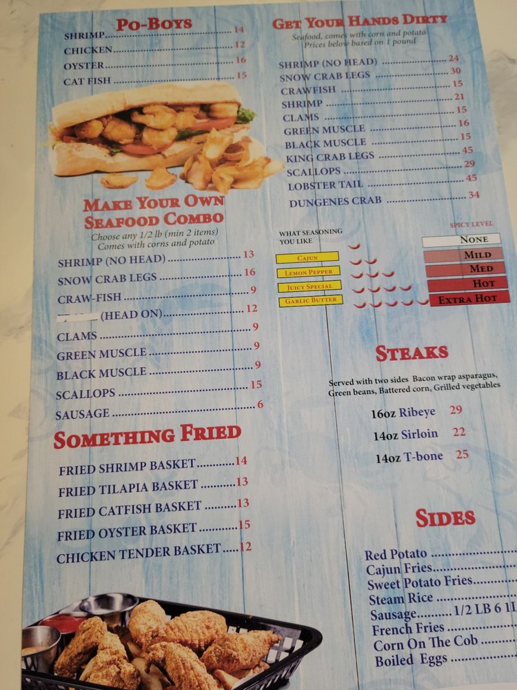 Introducing the menu of Superior Crab Vicksburg, a seafood haven located at 3419 Pemberton Square Blvd, Vicksburg, MS. This charming eatery specializes in delicious seafood burgers and an array of fried baskets, including shrimp, tilapia, catfish, and oysters, each priced at a reasonable $15.00. Add a side of Cajun fries or indulge in a succulent lobster tail for $24.00.